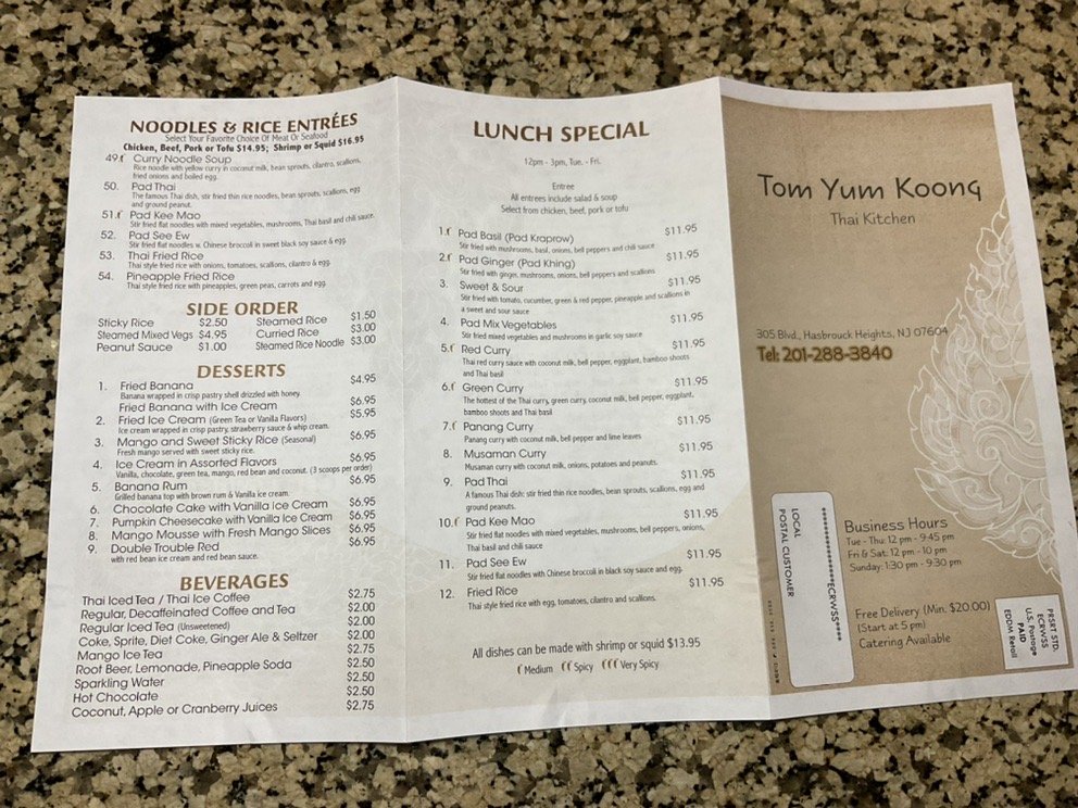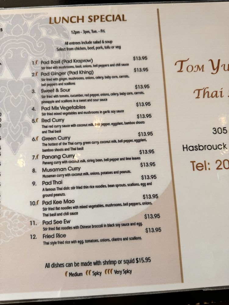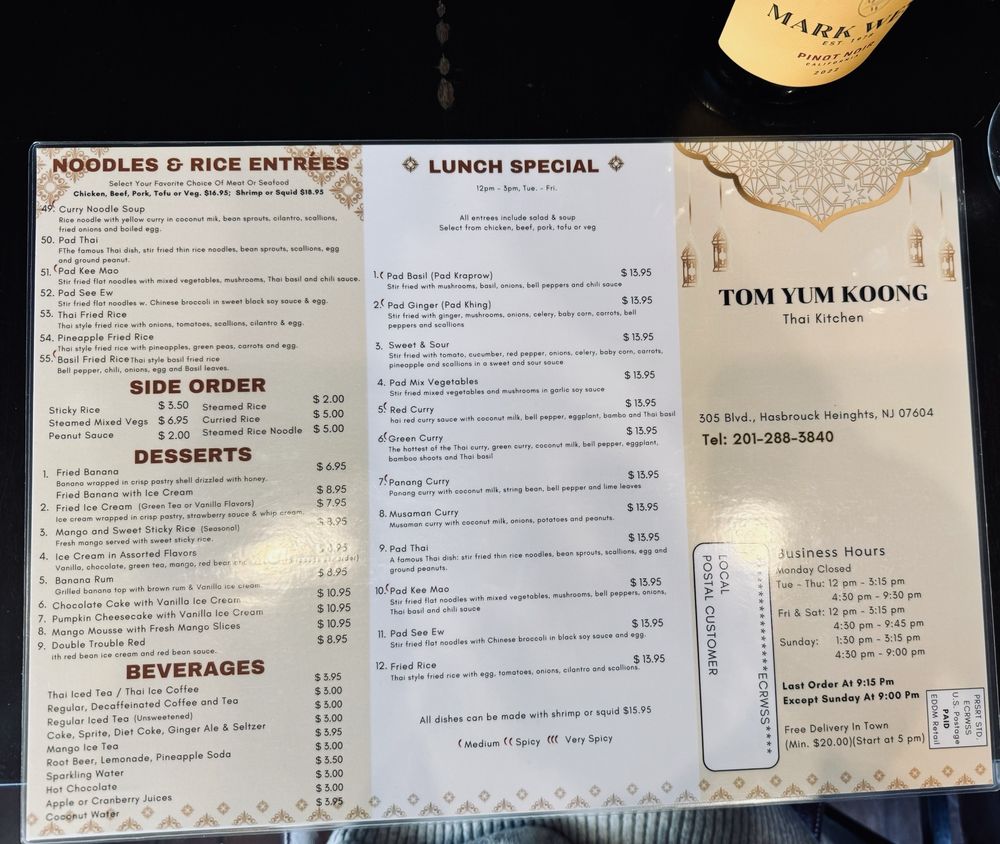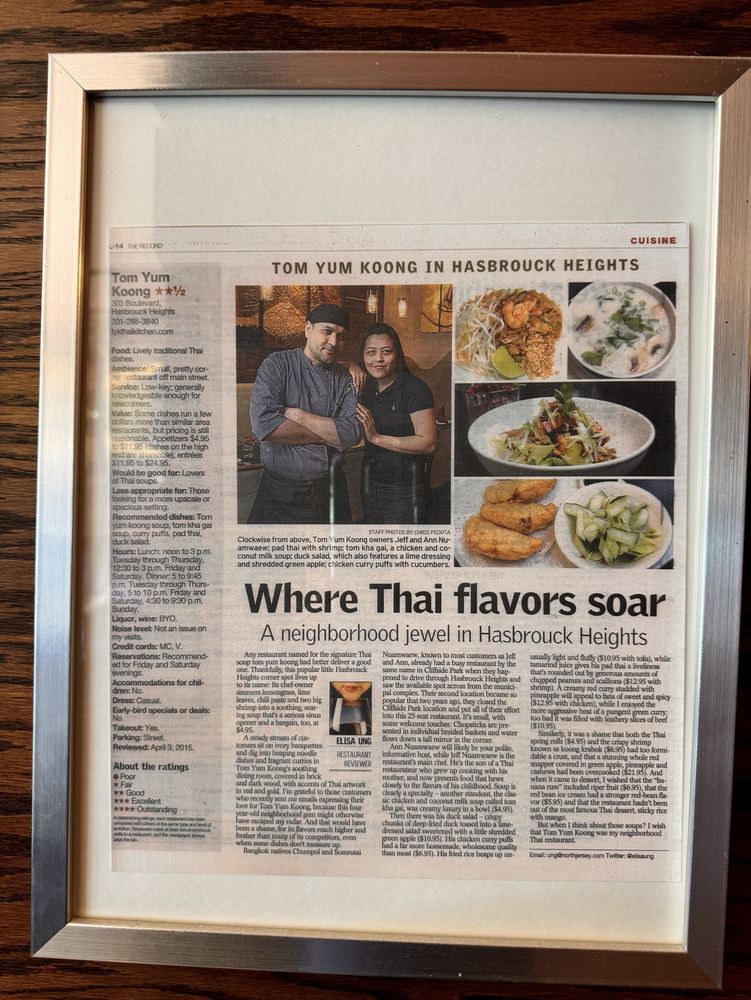 Tom Yum Koong Thai Kitchen, located in Hasbrouck Heights, NJ, offers a range of traditional Thai dishes with a modern twist. With a menu that includes Satay Chicken, Tom Yum Koong Shrimp soup, and Thai Salad, this restaurant caters to a variety of palates, including vegans and vegetarians. Customers rave about the flavorful dishes, mentioning favorites like Green Curry, curry noodle with tofu, and red curry with chicken. The cozy yet elegant atmosphere, friendly staff, and prompt service make dining at Tom Yum Koong a delightful experience. With street parking available and the option for reservations, this restaurant is perfect for a casual meal or a special occasion. Don't miss out on the opportunity to savor the authentic flavors of Thailand at Tom Yum Koong Thai Kitchen.